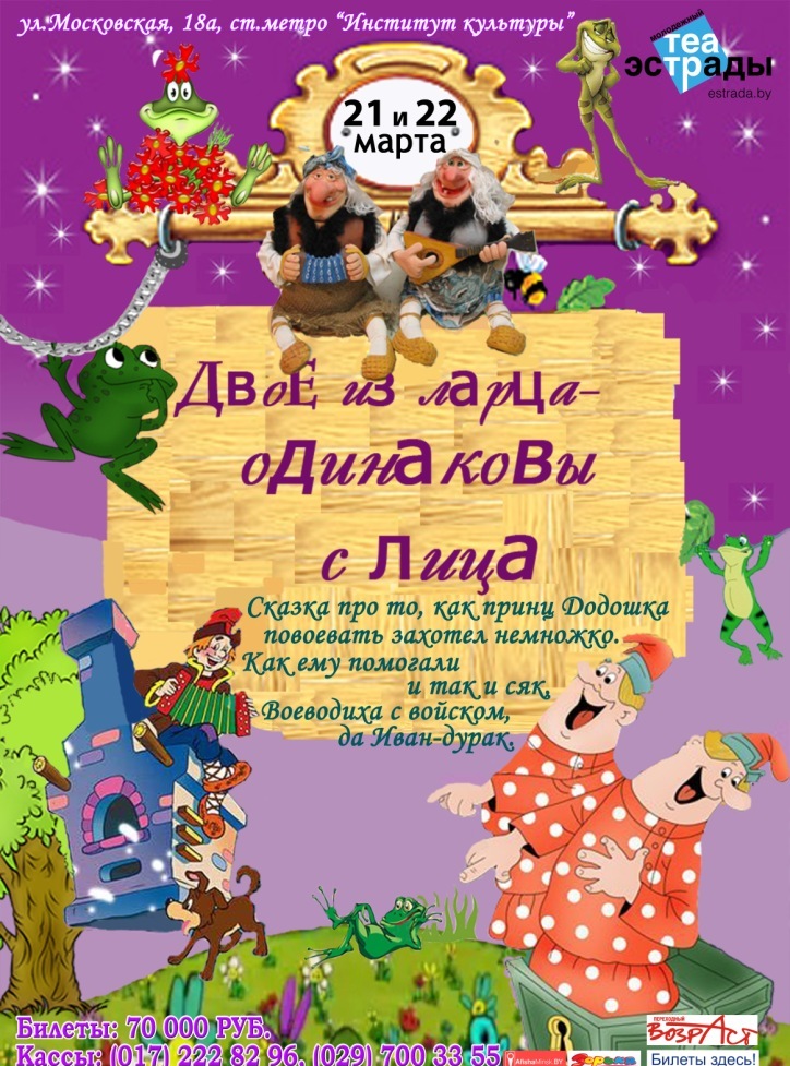 Весёлую музыкальную сказку «Двое из ларца — одинаковы с лица» дарит своим юным зрителям Молодёжный театр эстрады. Вас ждут увлекательные приключения по сказочным местам вместе с Принцем Додошкой, Иваном-Дураком, Братьями из ларца и ехидными старушками — Кикиморой и Бабой-Ягой.