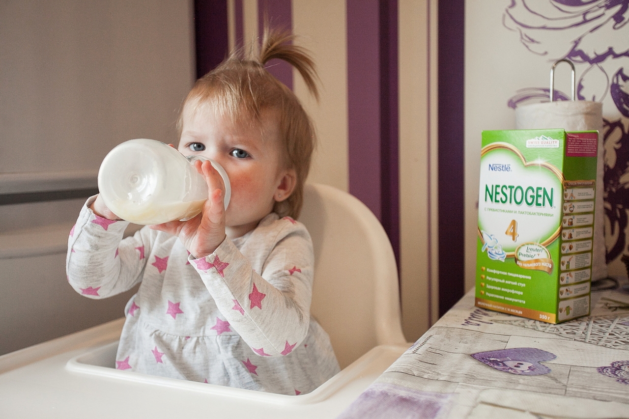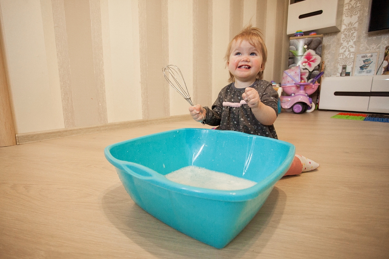 Примечание: Как ни просили старшие дети венчик, Ксюша его никому не отдала. И что удивительно: на этот раз играла очень аккуратно. После взбивания пены заметно устала и проголодалась — тут пришлось как нельзя кстати детское молочко NESTOGEN®.