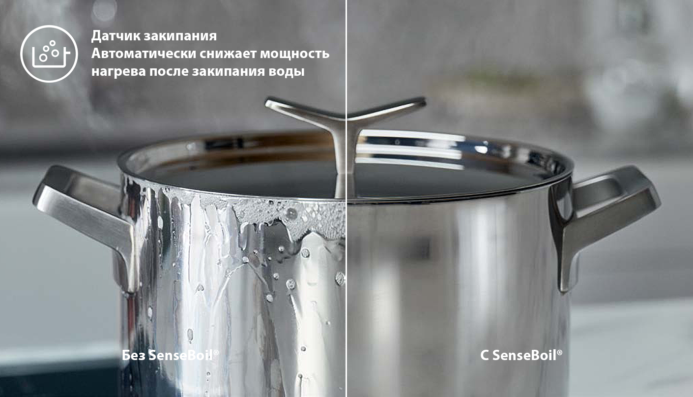 Весьма полезная функция варочных панелей — SenseBoil®, которая отслеживает момент закипания воды при помощи датчика вибрации и автоматически снижает мощность нагрева. Хозяйка может заниматься другими делами, не боясь, что оставленная на поверхности жидкость выкипит и зальет плиту. Технология SenseBoil® работает как с водой, так и бульонами, кашами на воде, овощами, под крышкой или без нее.