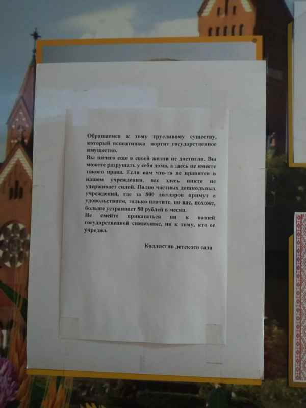 Телеграм-каналы опубликовали объявление, которое вывесили в одном из детских садов Минского района. Коллектив обращается к некому «трусливому существу, которое исподтишка портит государственное имущество», а точнее — госсимволику. Родителям напоминают, что альтернативой госсада может стать частный.