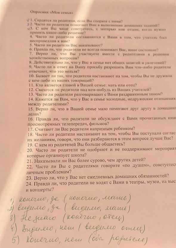 — На мой взгляд, некоторые вопросы очень личные, касаются только нашей семьи. И варианты ответов тоже странно поданы. Мне самому трудно разобраться сходу, а тут речь о 15-летнем подростке! Формулировки настолько неоднозначные, что выводы можно сделать какие угодно.