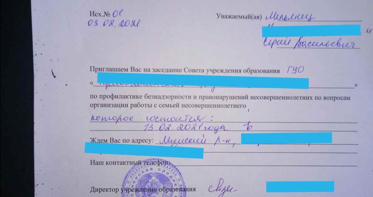 Несколько дней назад Сергею позвонили из школы, где учится один из его сыновей, и предупредили: придет проверка, которая будет обследовать условия жизни и воспитания несовершеннолетних. Поводом послужило письмо из УВД Минского района, в котором директора уведомили об административном правонарушении, совершенным Сергеем.