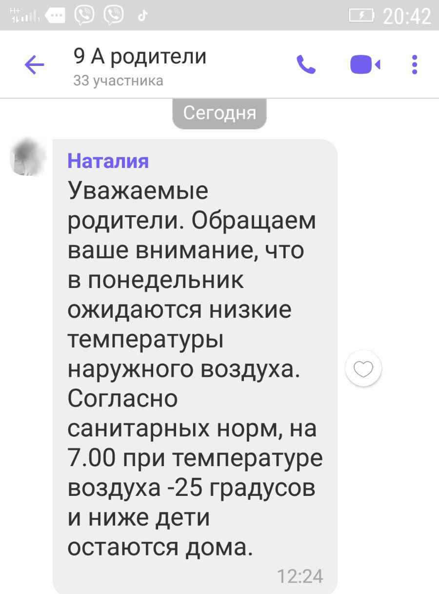 «Во избежание обморожения детей, сохранения их здоровья занятия для 1−11 классов на понедельник отменяются и будут отработаны в другие более благоприятные дни. Если вы все же хотите привезти ребенка в учреждение, для него будет организован полноценный образовательный процесс», — такая новость опубликована в родительских чатах.