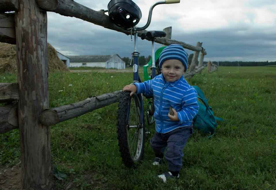 В первый раз Фёдор катался на велосипеде. Решилась на поездку в магазин в соседний городской поселок 7 км езды в одну сторону. На старый дорожный велосипед был привязан обычный пластмассовый стульчик. А Фёдор пристегнут мужским ремнем.