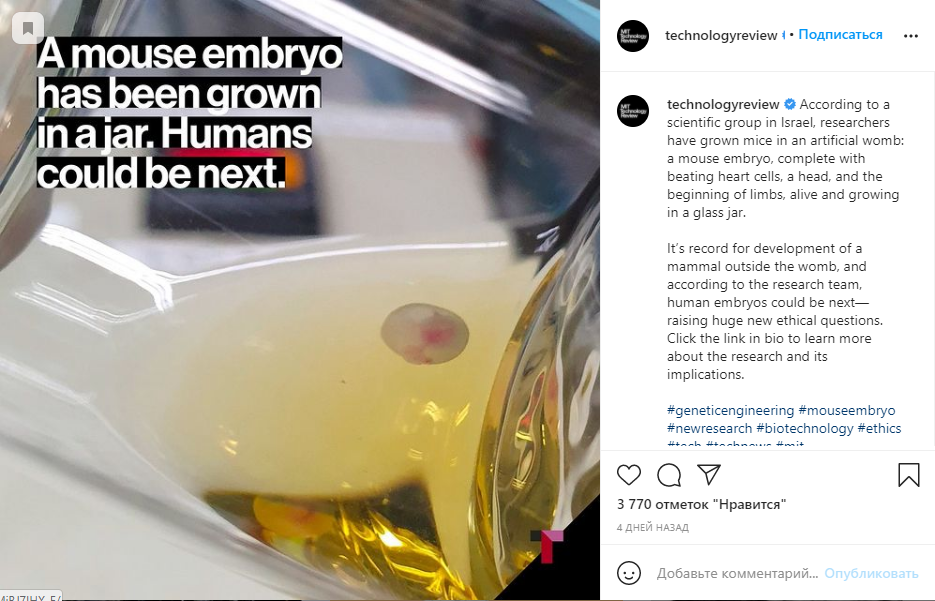 В том же году ученые из Кембриджского университета заявили, что им удалось «собрать» эмбрион мыши из стволовых клеток — также вне утробы матери. Целесообразность эксперимента объяснялась медицинскими целями.