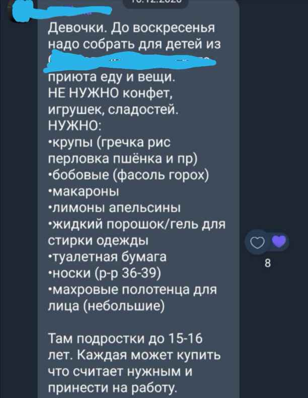 Почему коллеги из приюта просят фасоль, туалетную бумагу и другие банальные вещи, которые не украшают наше общественное сознание по поводу благотворительности? Возможно, знают, что женщины из компании, которую мы не называем, будут паковать подарки сами. И администрации не стыдно у давних знакомых попросить то, что нужнее, а не бесполезные наборы конфет.