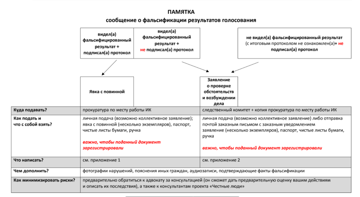 По-прежнему можно обращаться в инициативу “Честные люди”. Ее создатели обещают, что данные из анкеты будут приобщены к судебным делам и анонимно размещены на сайте. По словам Лены Живоглод, активистки инициативы, всего в рамках этой избирательной кампании к ним поступило более 6500 сообщений о нарушениях от наблюдателей, избирателей и членов УИК. Конкретно на членов и председателей УИК приходится 350 зафиксированных нарушений или фальсификаций.