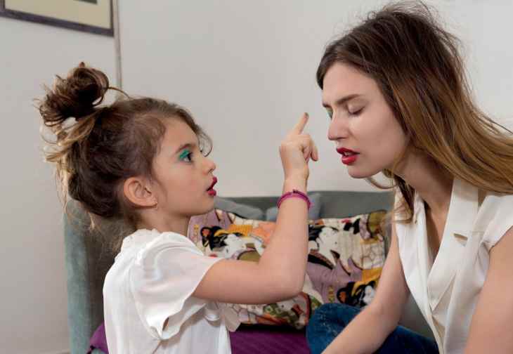 Следующее действие: девочке года 4. Стоит возле зеркала и красит губы красной помадой мамы. На голове мамина шляпа. Следующий кадр: мама с папой сидят на диване, хлопают и смеются. Дочь с неаккуратно накрашенными губами, в шляпке и в маминых туфлях дефилирует по комнате.