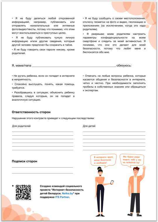 В документе четко прописаны правила, которым договаривающиеся стороны обязуются следовать. Причем обязанности есть не только у ребенка, но и у родителей. Пустые строчки оставлены для того, чтобы можно было вписывать требования, удобные именно вашей семье.