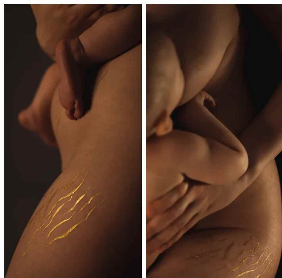 Российский фотограф Катерина Поник стала автором необычного фотосета. Она показала послеродовые растяжки крупным планом. Изъяны, которые принято скрывать, автор выделила золотыми линиями в древнеяпонской технике кинцуги.