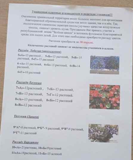 В гимназии на днях раздали листовку-приглашение. В ней говорится о важности озеленения, о том, что это выглядит эстетично и улучшает качество воздуха на территории школы. Родителям и классным руководителям предлагается принять участие в республиканской акции «Зеленая школа» и «заложить фундамент благоприятной среды для детей». Для этого участникам акции «необходимо приобрести рассаду цветов» — так говорится в листовке. Указаны четкие сроки и количество саженцев, которые необходимо купить каждому классу. Родители возмутились.