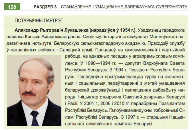 В учебнике за 11-й класс описание независимого периода Беларуси начинается с беловежских соглашений и принятия Конституции в марте 1994-го. Далее напечатана большая биографическая справка об Александре Лукашенко с его портретом. Написано, что в 1994 году прошли первые демократические выборы в стране, во втором туре победил А. Г. Лукашенко с поддержкой 80,3% избирателей.