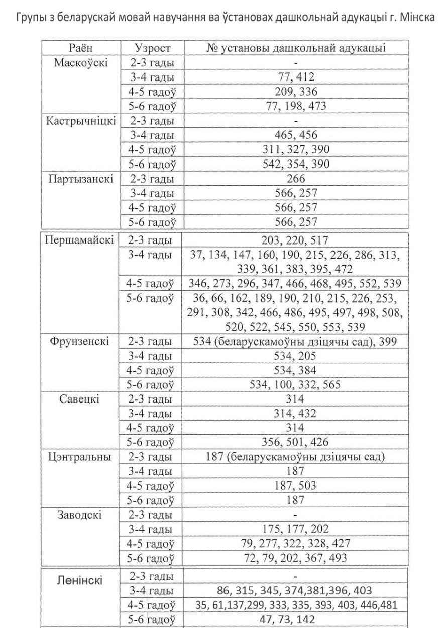 Александра в компании таких же родителей провела мониторинг детских садов в Минске с белорусскими группами. Вот такой список предлагает Комитет по образованию столицы.