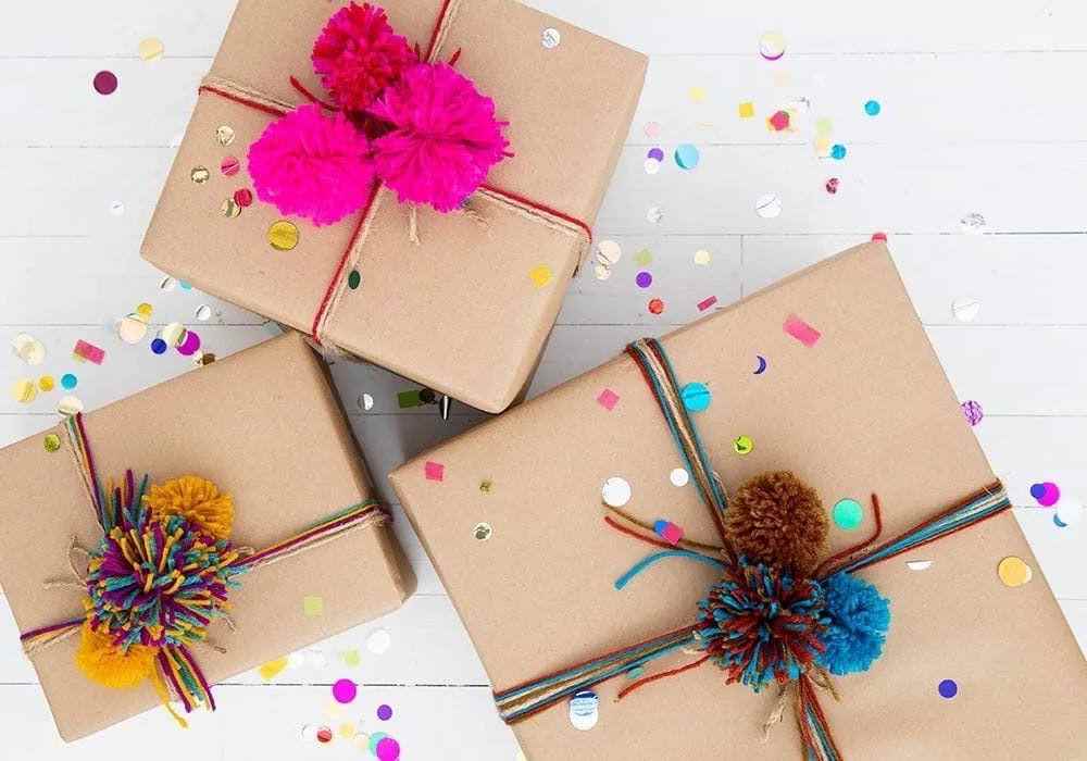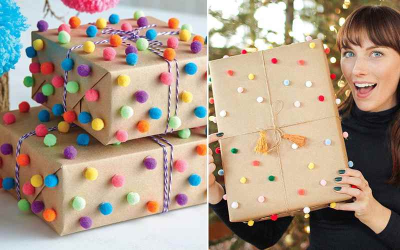 Если вам не хватает позитива и ярких красок, это отличный вариант для упаковки подарка. Для этого вам нужна лишь крафтовая бумага, клей, нитки и разноцветные помпоны, которые можно купить в любом крупном магазине.