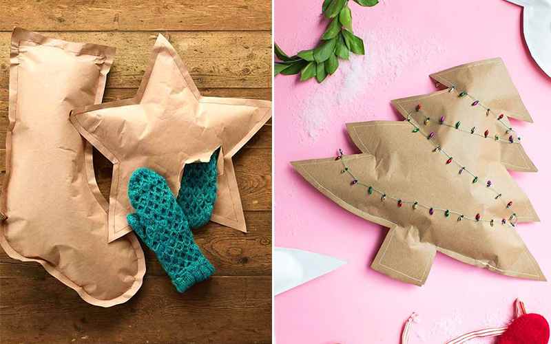 Если у вас дома есть швейная машина, то упаковку для подарка можно сшить из крафтовой бумаги. Выбирайте любую форму — сапога, елки или звезды.