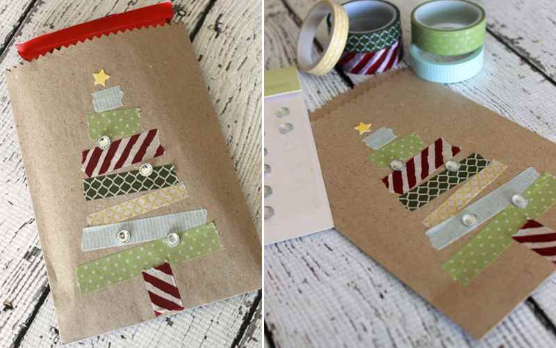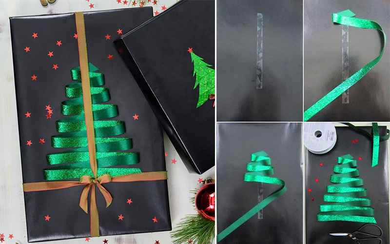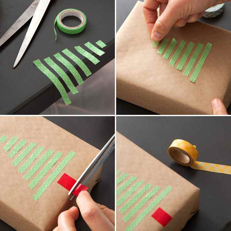 Украсить простую упаковку можно елочкой — главным символом Нового года. Можно сделать ее из цветного скотча, бумаги или ленточек.
