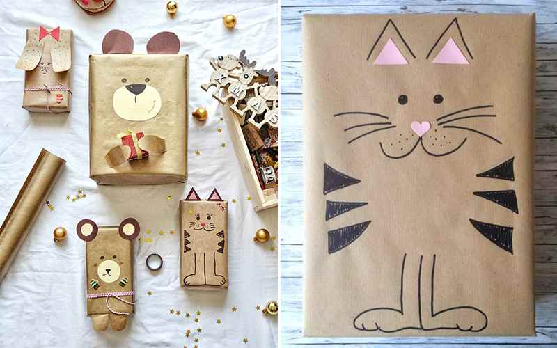 Хорошая идея для детских подарков — упаковка в виде зверюшек. Нарисуйте на крафтовой бумаге глазки и носик, сделайте ушки и хвостик и приклейте их к бумаге. Такая упаковка приведет в восторг детей.