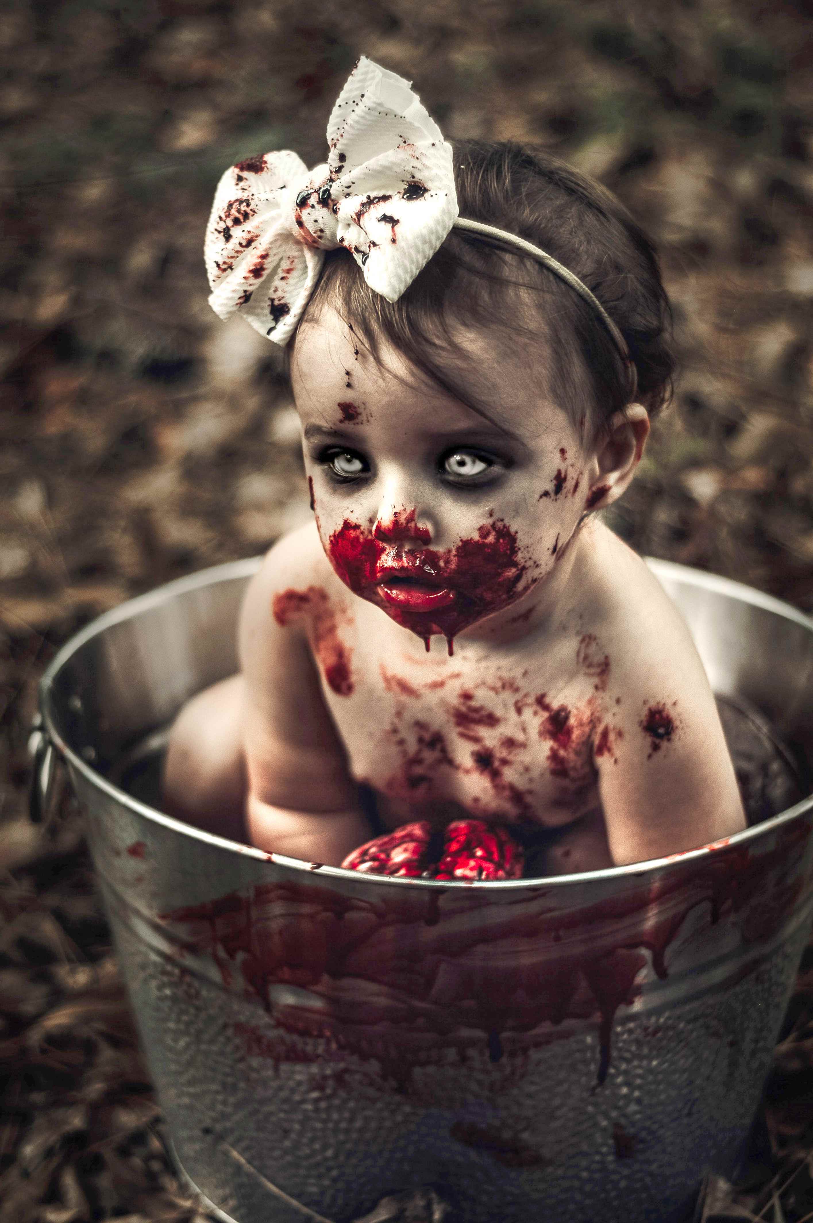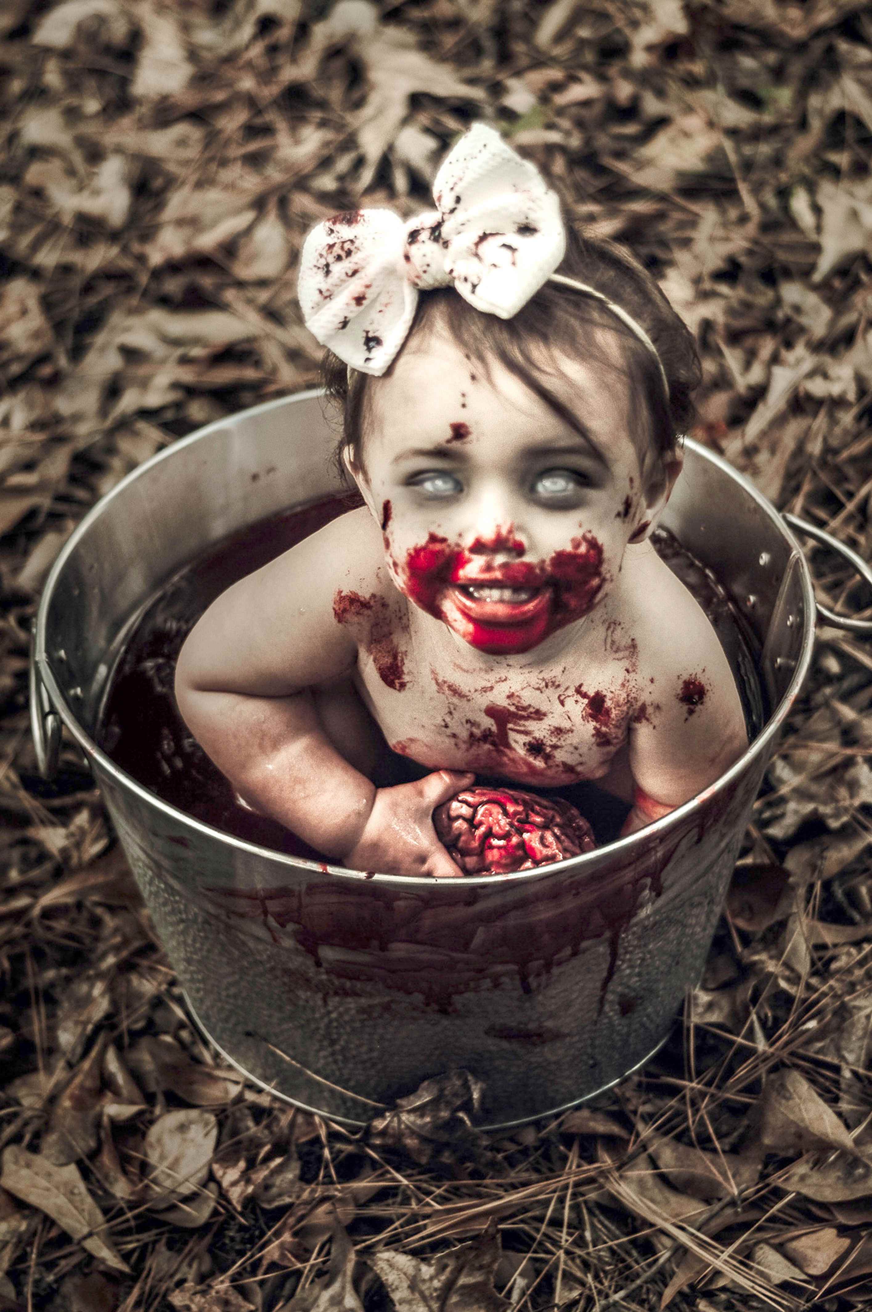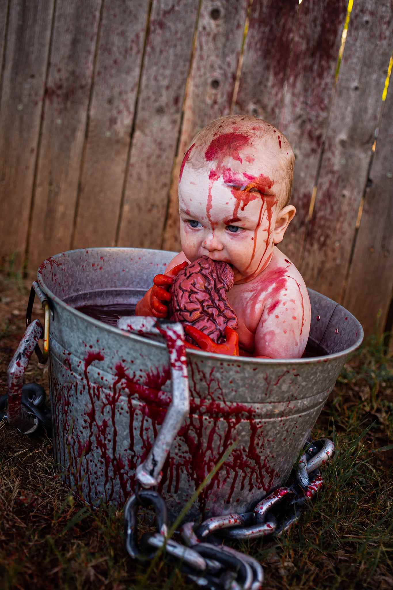 Американский фотограф Карли Томас тоже решила сделать героями хеллоуинской фотосессии своих детей — 12-месячную Коралину и 4-летнюю Октобер. Они сыграли роли окровавленной девочки-зомби и пугающего младенца, который сидел в ведре с кровью и держал в руках человеческий мозг.