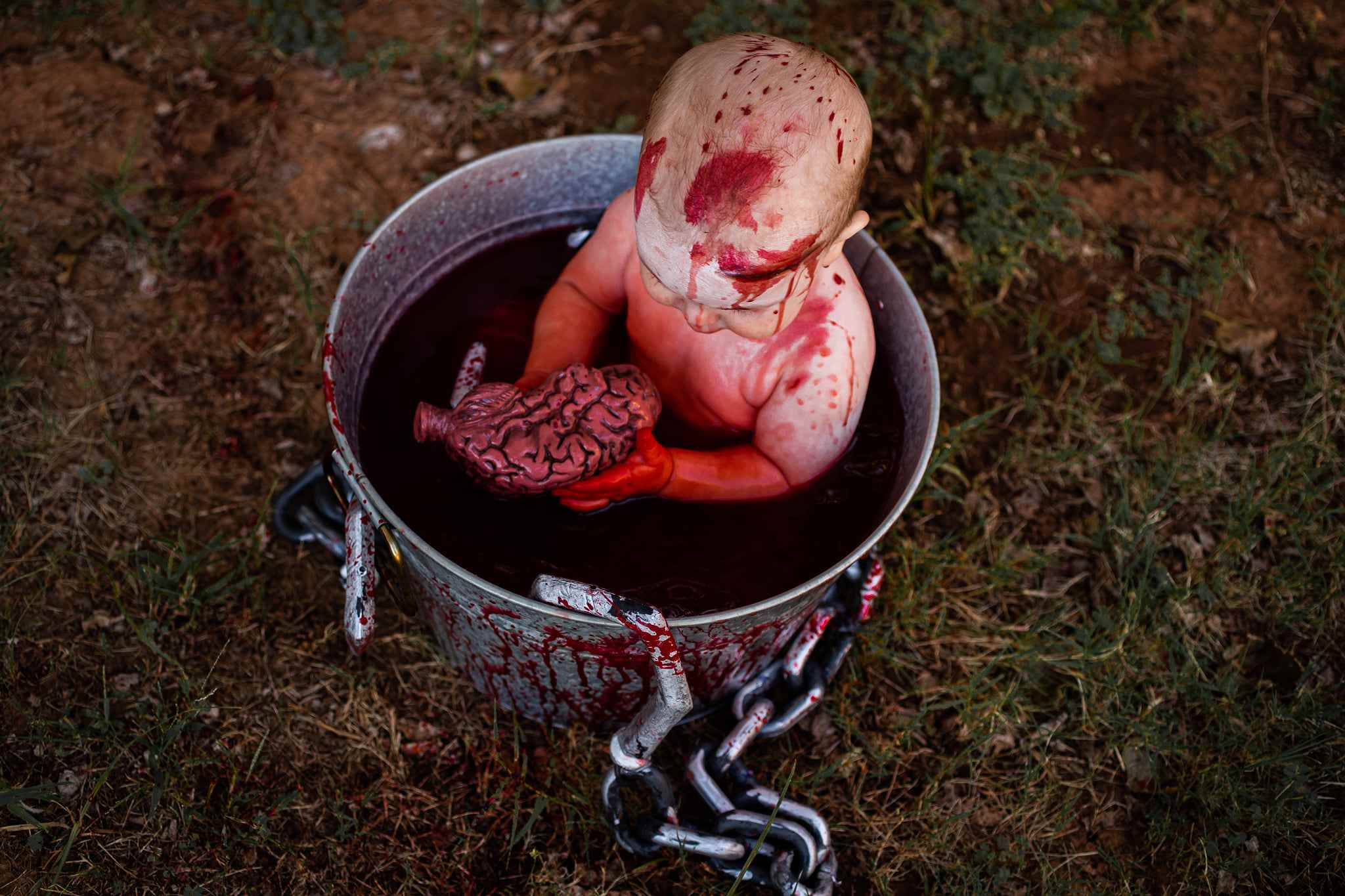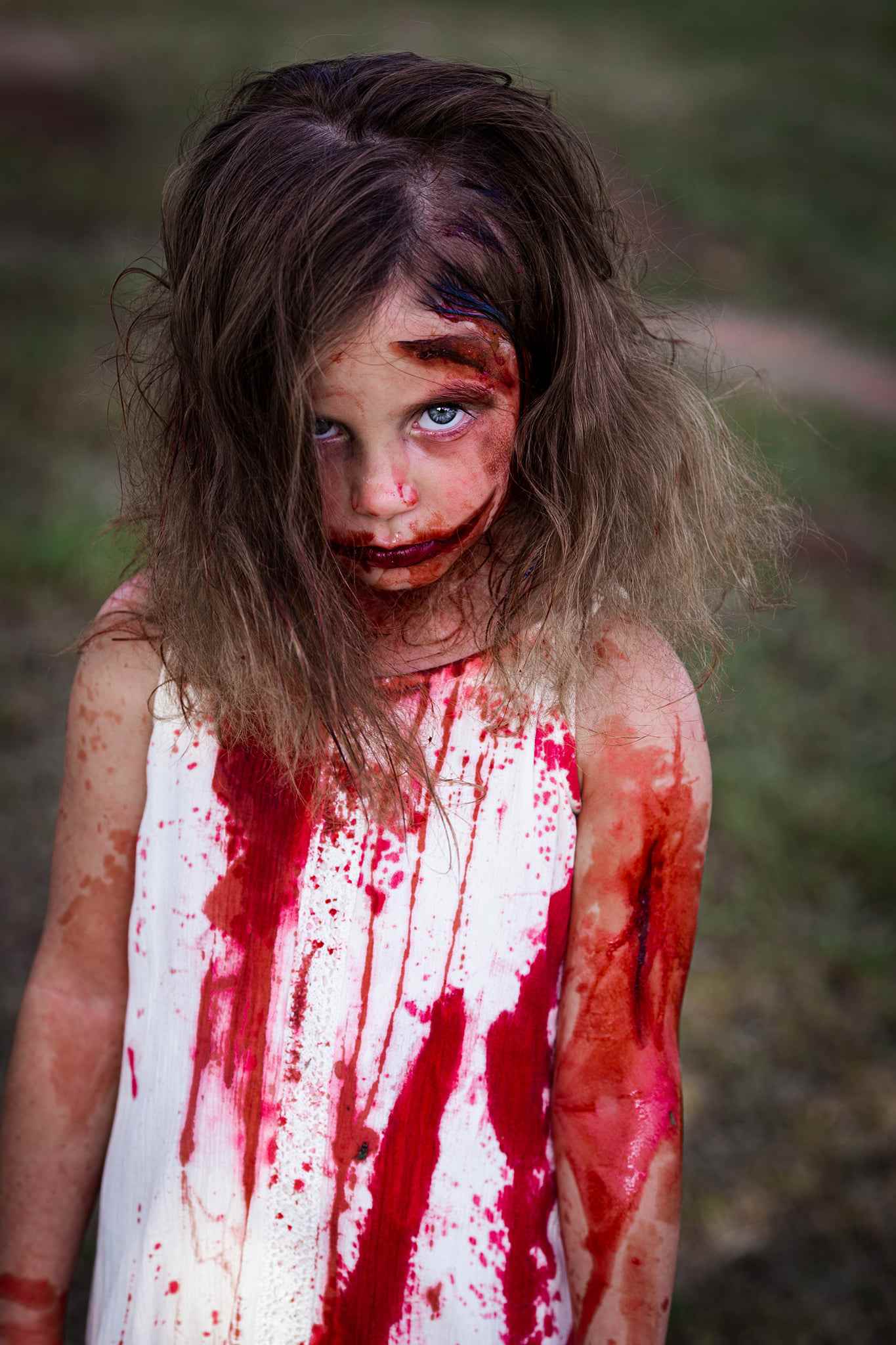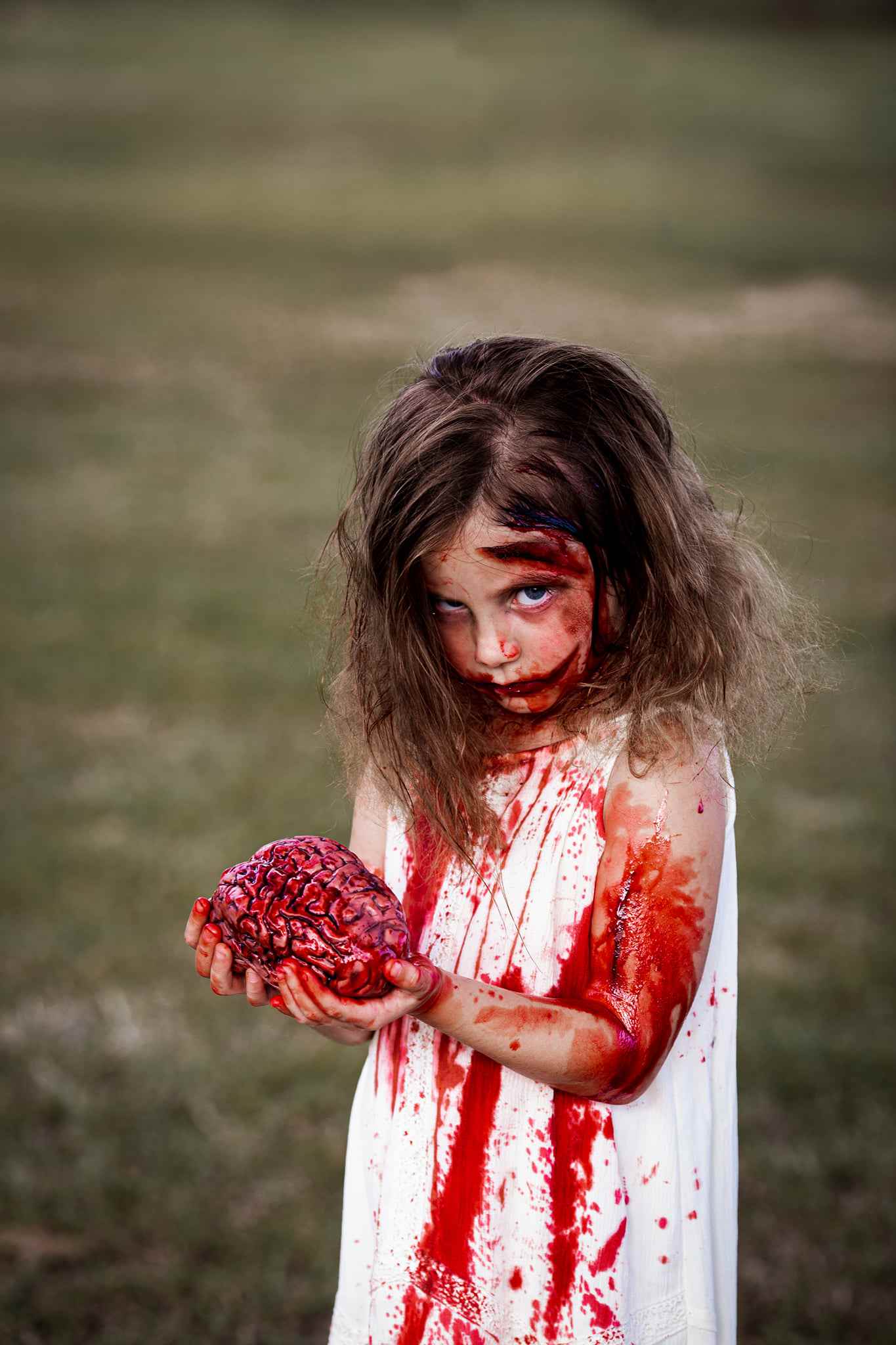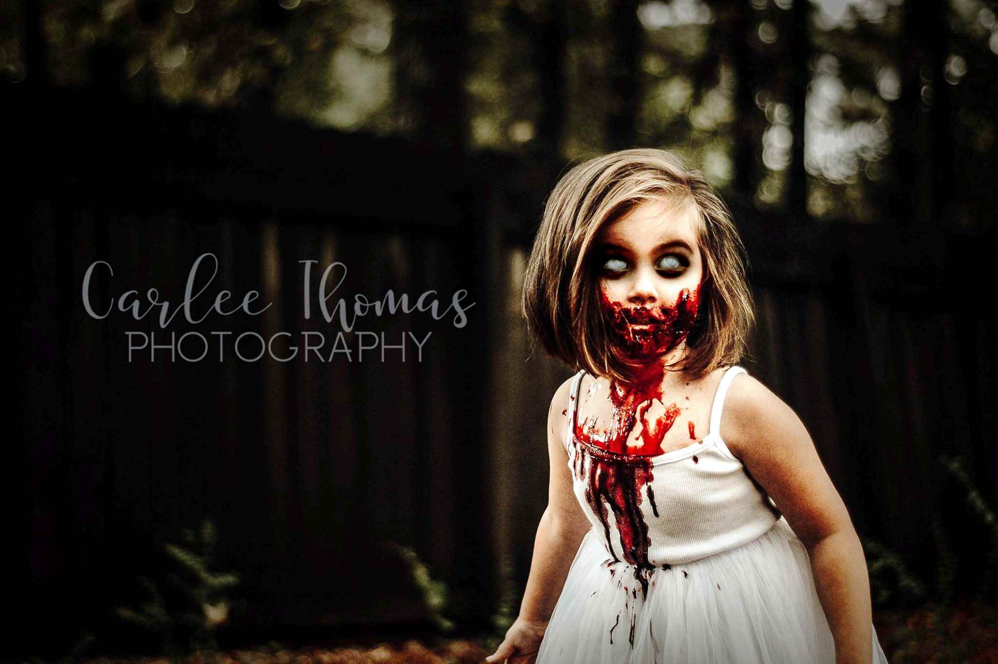 Американский фотограф Карли Томас тоже решила сделать героями хеллоуинской фотосессии своих детей — 12-месячную Коралину и 4-летнюю Октобер. Они сыграли роли окровавленной девочки-зомби и пугающего младенца, который сидел в ведре с кровью и держал в руках человеческий мозг.