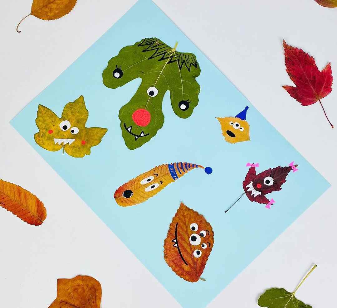А можно из листьев сделать вот таких смешных монстров. Понадобится клей, маркеры и всякая мелочевка: бусины, помпоны, глазки и т.п.