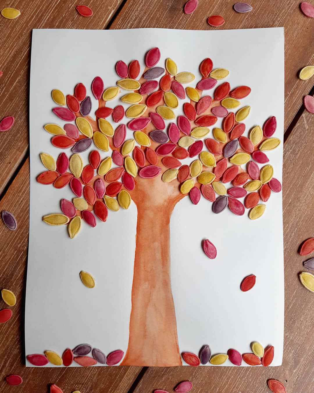 Вместо листьев можно использовать тыквенные семечки. А чтобы такое дерево получилось ярче, заранее нужно покрасить семечки в разные цвета.