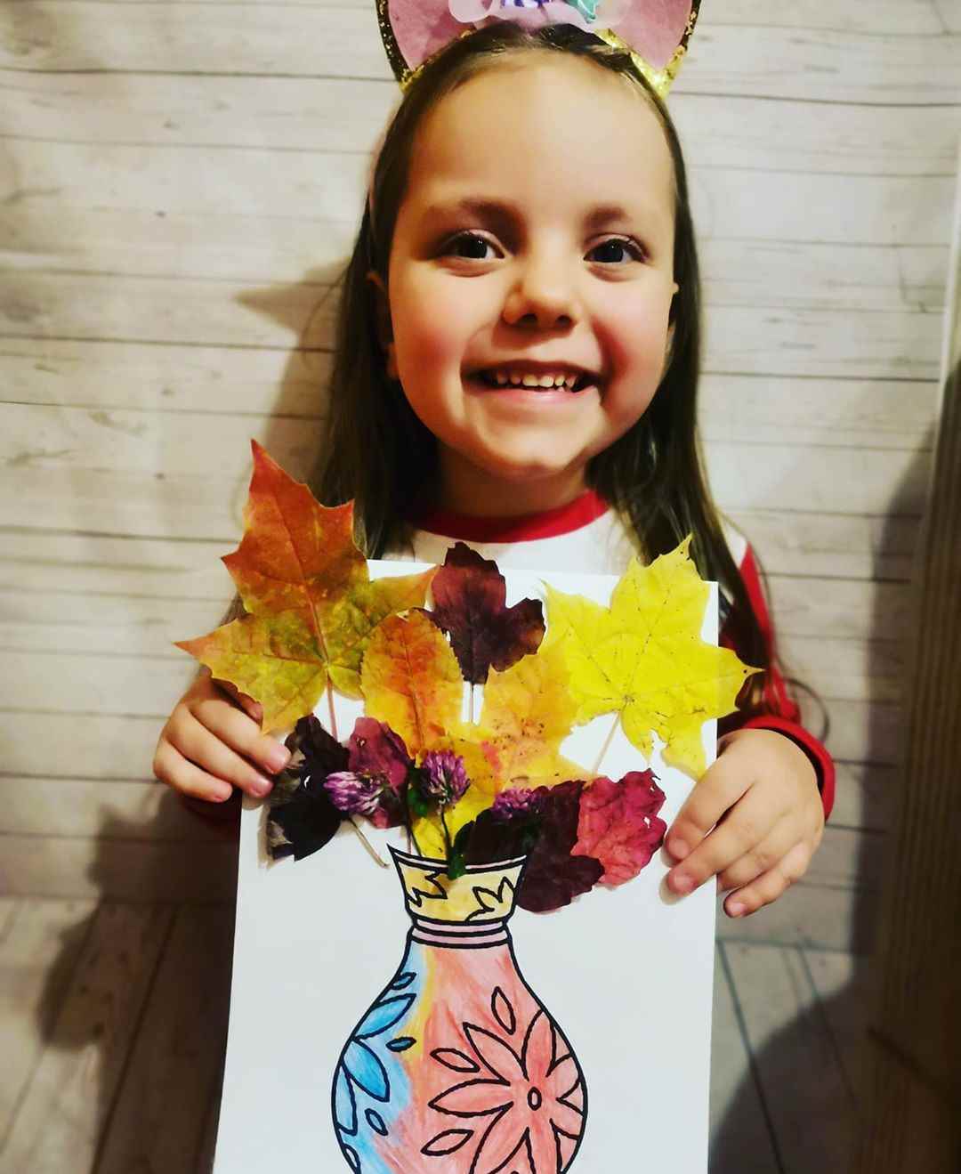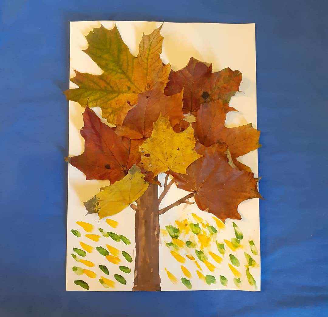 Из опавших листьев также можно сделать аппликации в виде деревьев и букетов в вазах. Для этого наклеиваем листья на бумажную основу с напечатанным или нарисованным шаблоном (вазы или ствола дерева). Вот что из этого может получиться.