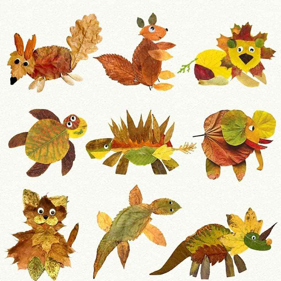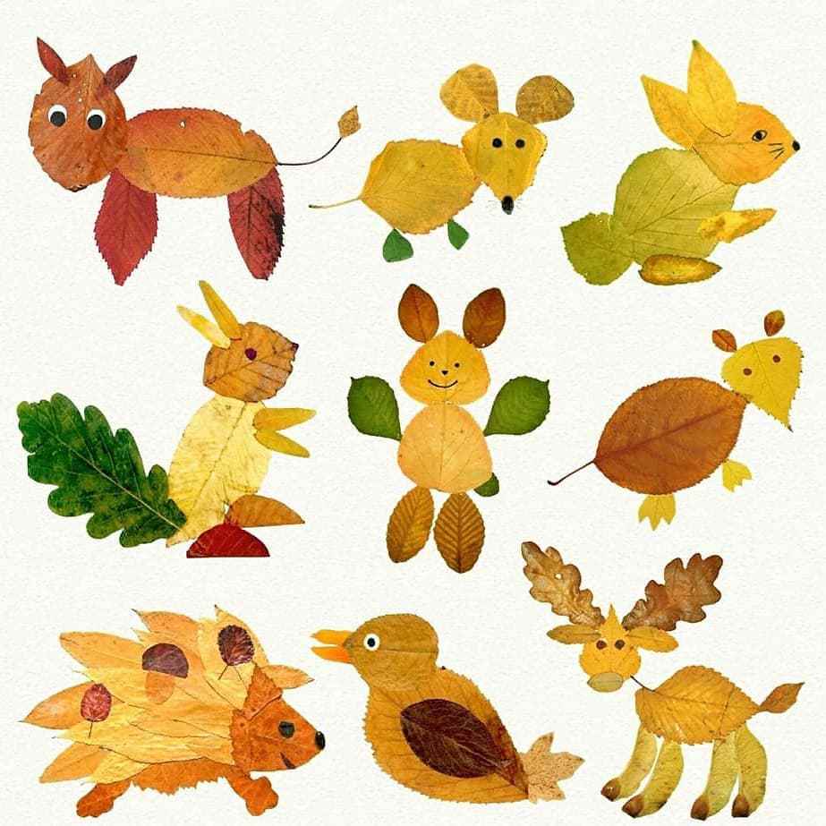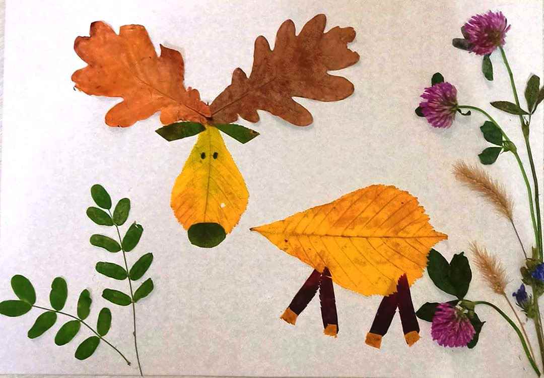 Из листьев можно вырезать более мелкие детали: рога, носы, лапы. Только учтите, что листья должны быть недавно опавшими, потому что сухие при резке будут крошиться.