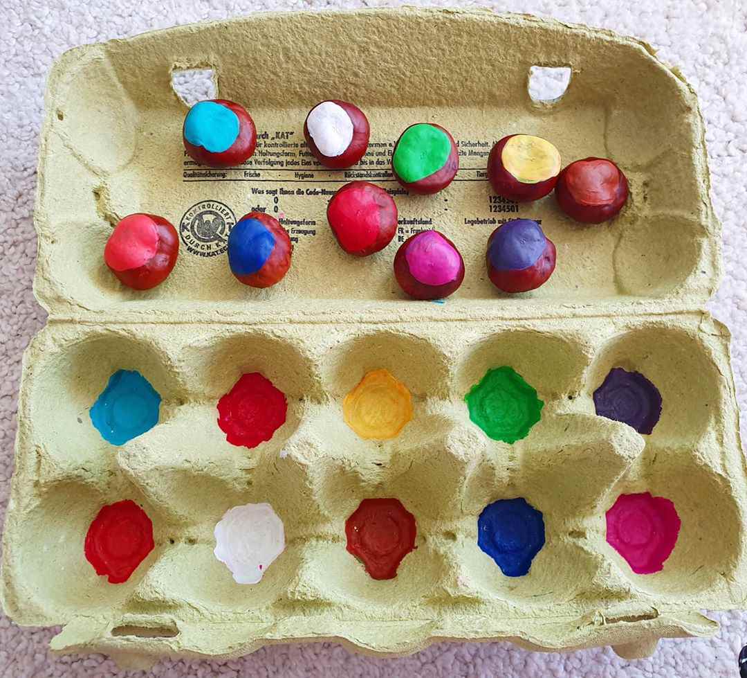 Из каштанов можно сделать развивашку для малышей в стиле подбора цветов по шаблону. Для изготовления такой игры нужны всего лишь каштаны, краски и пустая коробочка из-под яиц.