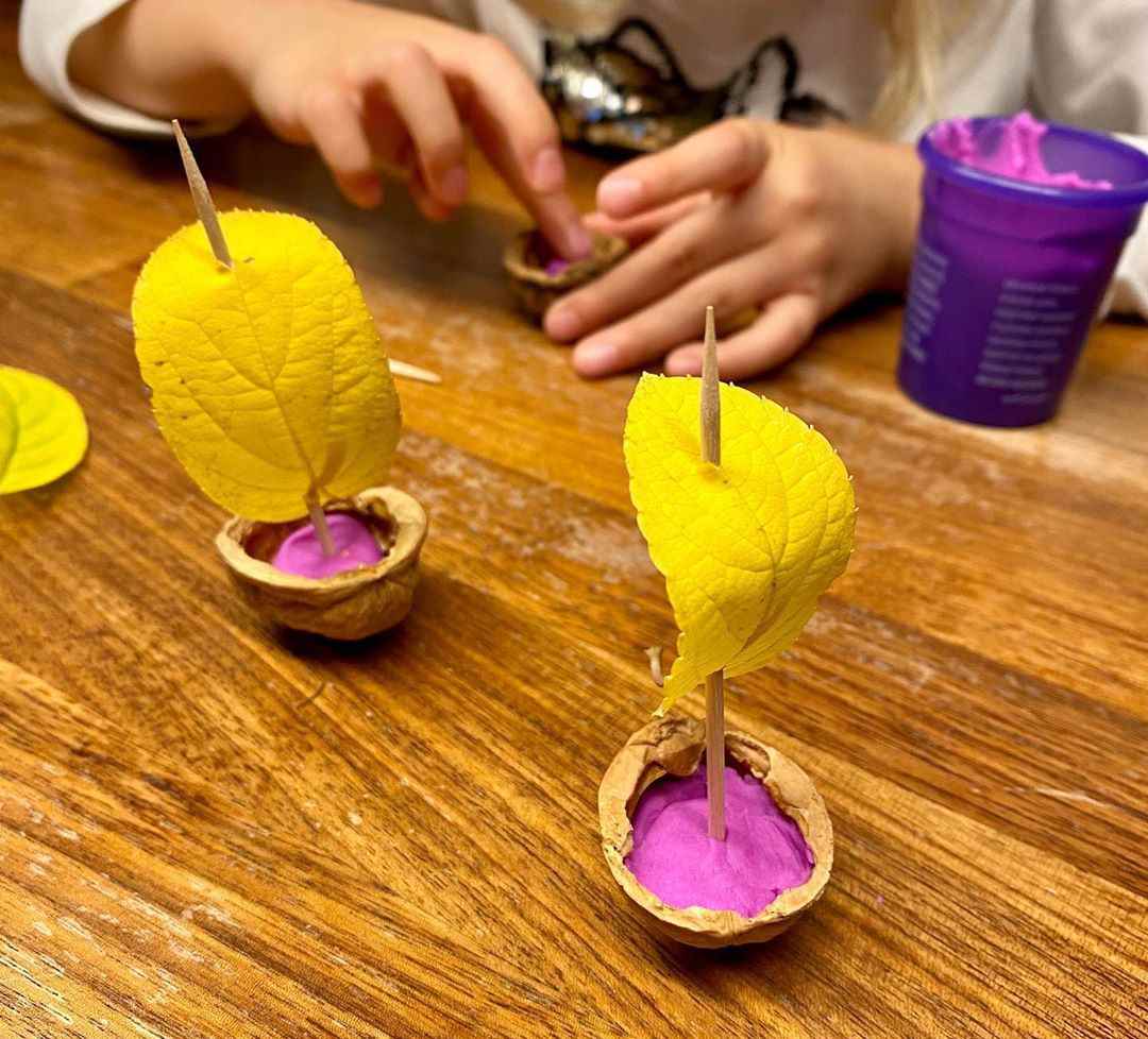 Каштаны, листья и желуди можно можно использовать не только для поделок, но и для игр. Например, это могут быть кораблики, которые можно запускать в ванне или луже во дворе. Для этого вам понадобятся листья, зубочистки, пластилин и скорлупа от грецких орехов. Эта идея родом из СССР, но она до сих пор приводит в восторг маленьких детей. Нет дома грецких орехов? Вместо скорлупы вполне можно использовать кусочек коры плоской формы.