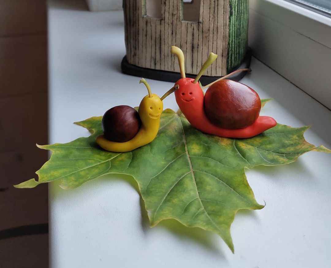 Каштаны, которые так любят дети, можно использовать для создания животных, например, улиток. Можно дополнить композицию листиком-подложкой, а рожки улиток сделать из ножек листьев. Вот как выглядит такая поделка.