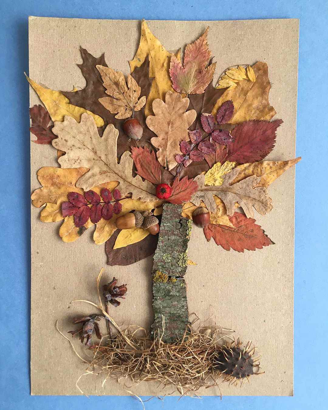 Или же можно вообще сделать все дерево из природных материалов: листьев, коры, желудей. Получится почти настоящее деревце!