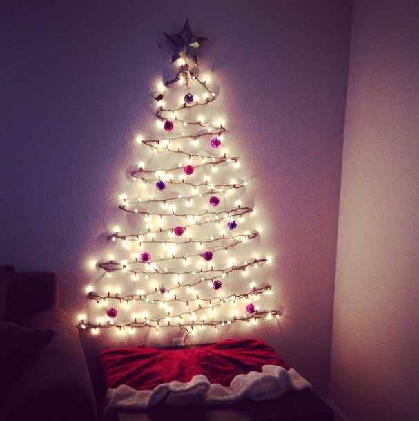 Возьмите обычную длинную гирлянду и закрепите ее на стене с помощью скотча или булавок. Повесьте на нее игрушки и мишуру. Еще можно купить конусную гирлянду и закрепить ее на люстре. Получится объемная елка. Только на забудьте, что устанавливать елки из гирлянд нужно рядом с розетками.