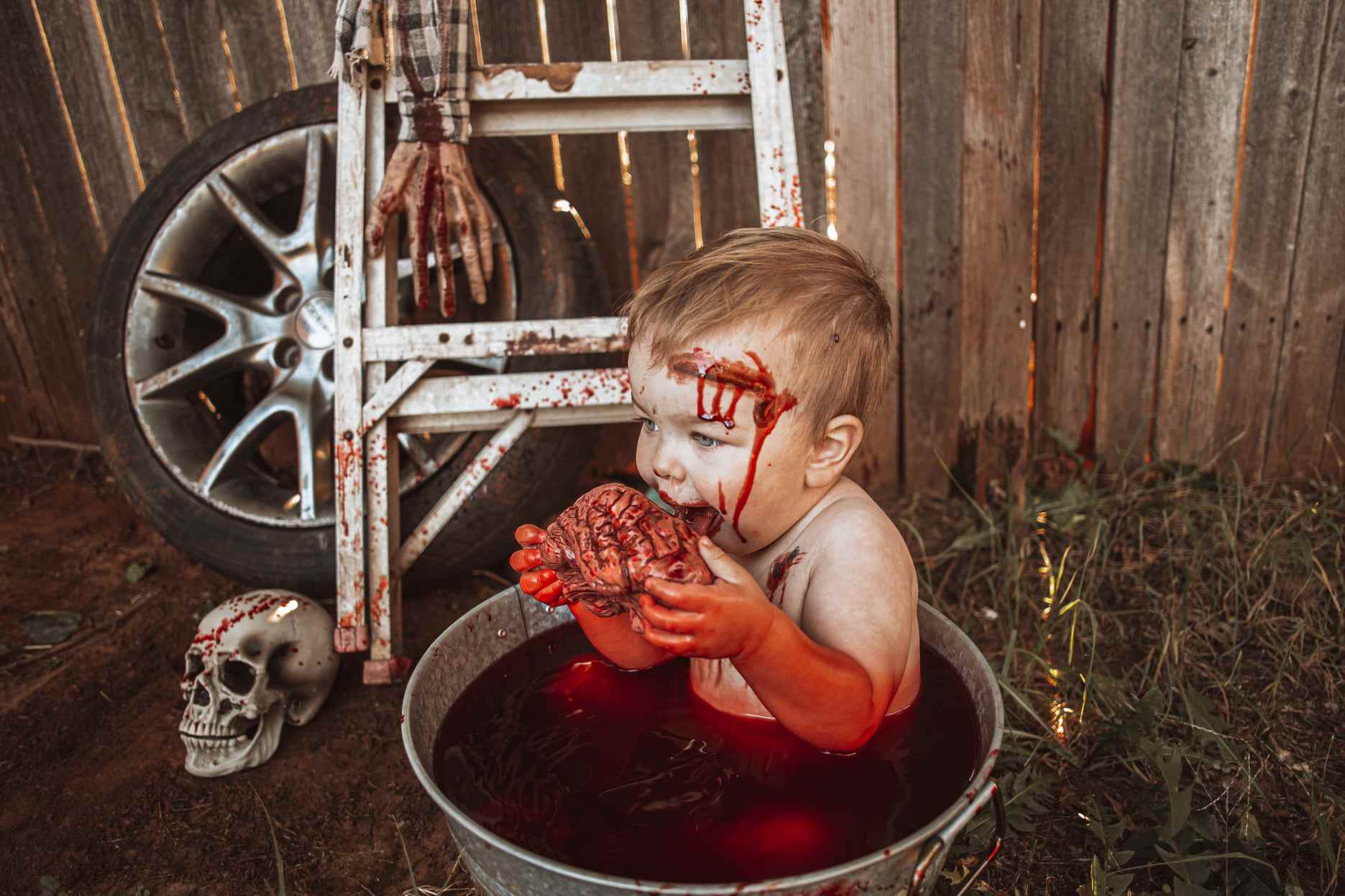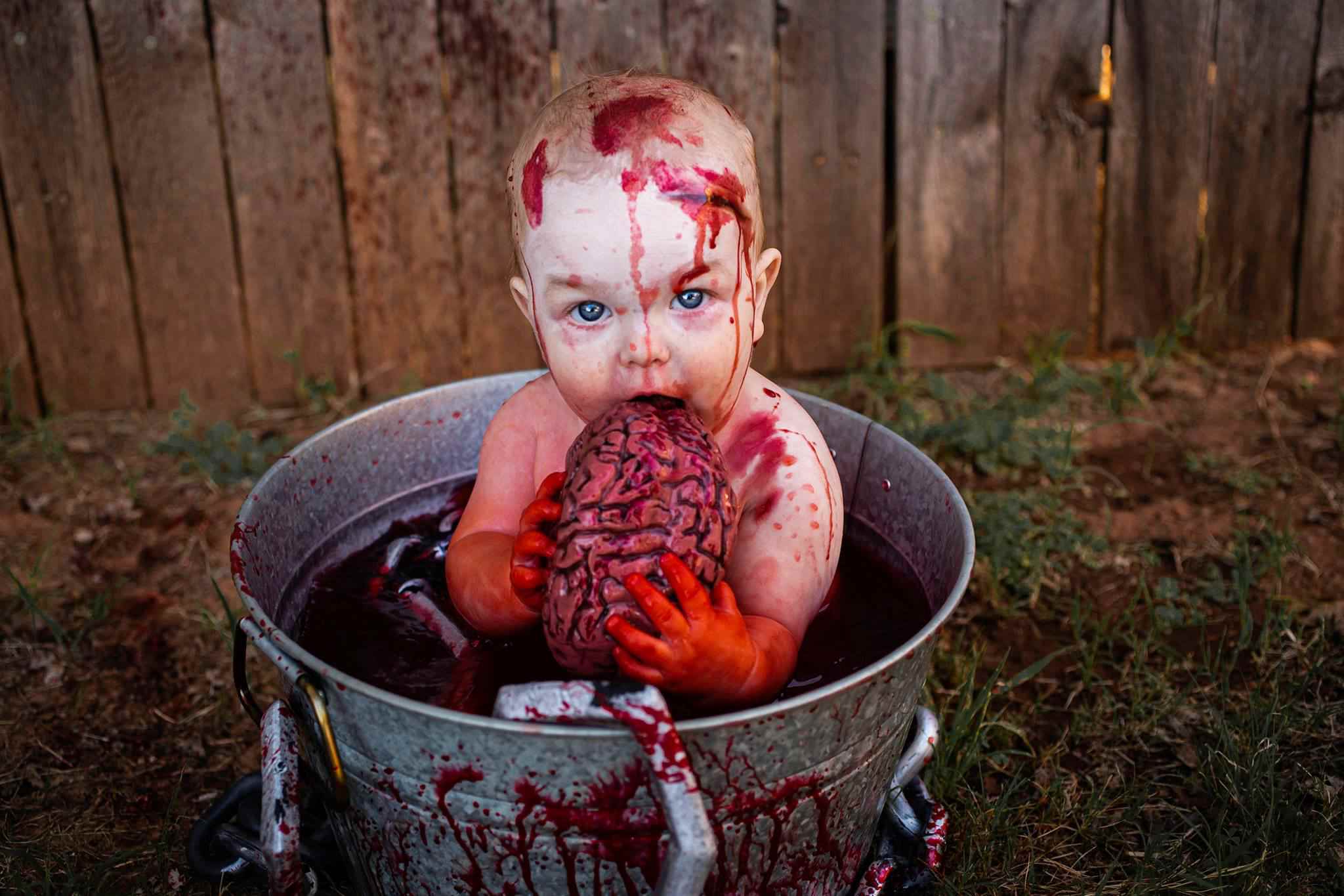 26-летний фотограф Бобби Райлант из США решила устроить для своих детей необычную съемку в преддверии Хеллоуина. Фото 10-месячного Камдена получились более чем тематическими: малыш сидел в ведре с кровью и ел что-то похожее не человеческий мозг. Конечно, все атрибуты были ненастоящими, но от этого снимки не стали безобидными.