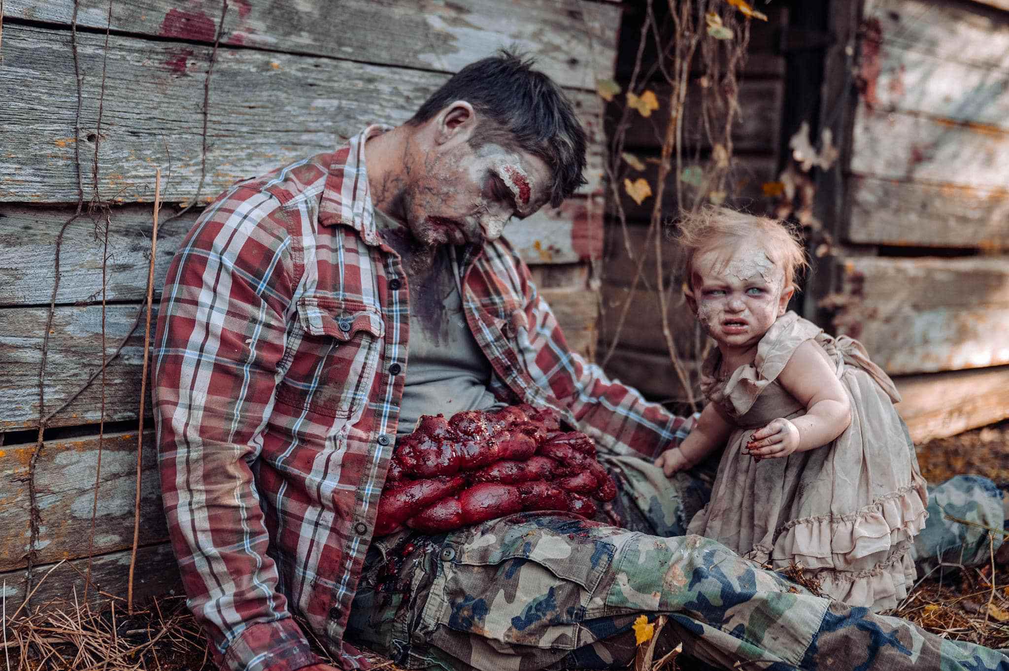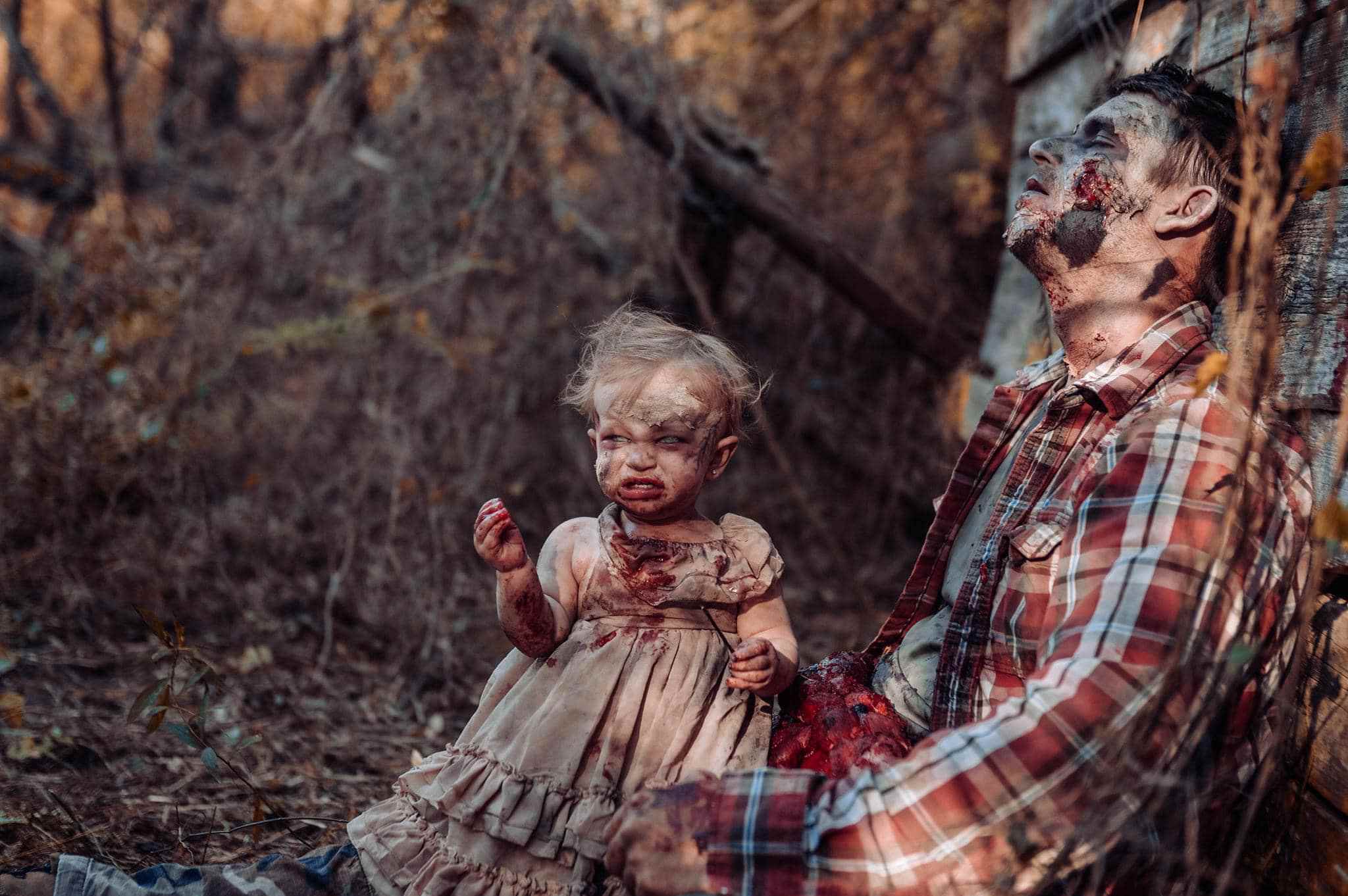 Фотограф и медсестра из Орегона Тиффани Ренфро устроила тематическую фотосессию к Хеллоуину для своей 11-месячной дочери и мужа. Они примерили на себя образы зомби-малышки и ее павшей жертвы.