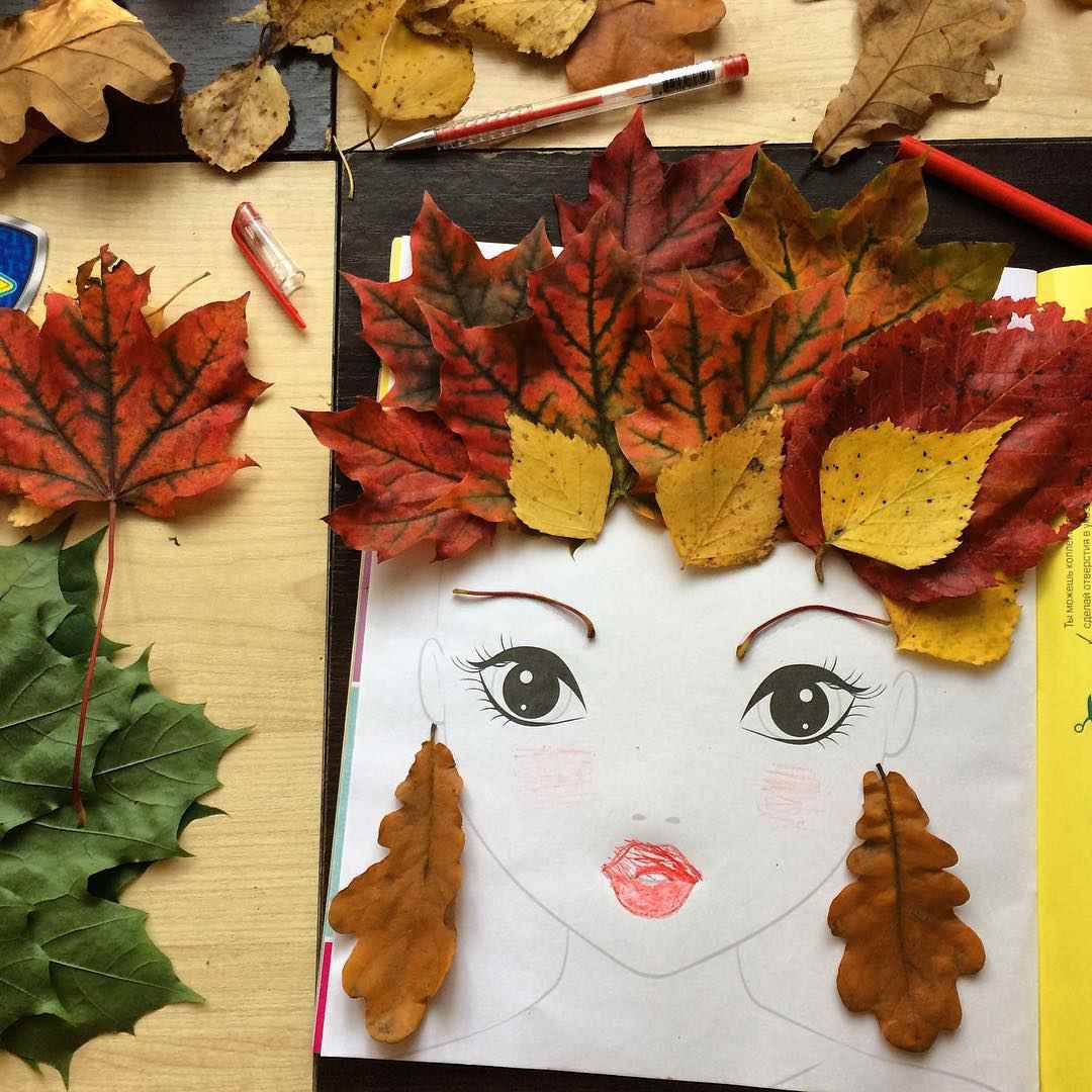 Девочкам придется по душе идея создания причесок из ярких листьев. Для этого нужно заранее нарисовать на бумаге лицо, волосами станут листья. Вот какие прически могут получиться.