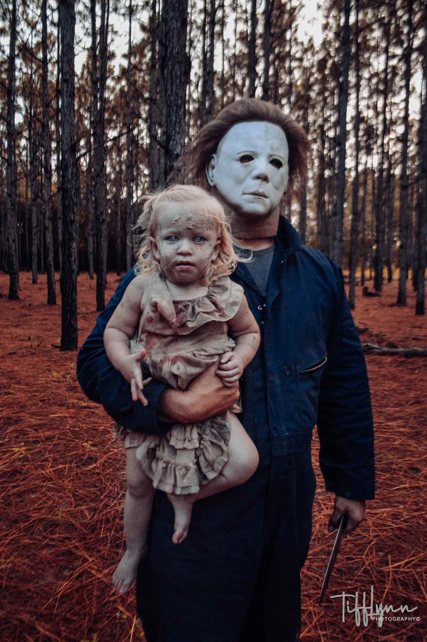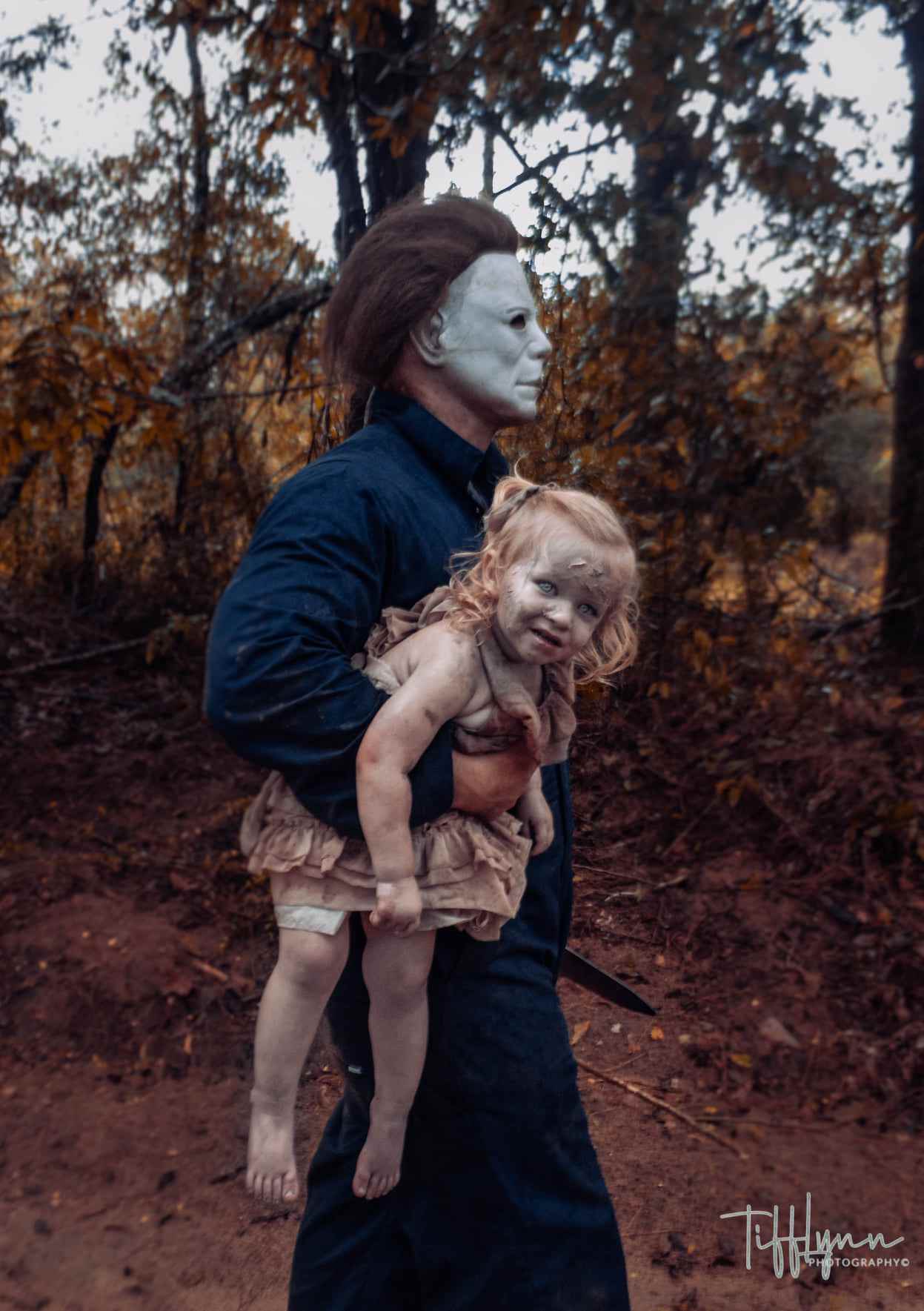 Фотосессия проходила в лесу. Сначала мама сделала пару фото у заброшенного сарая, где малышка Окли сидела рядом с отцом Дэниэлом и играла с его внутренностями и оторванной рукой. Затем девочку-зомби понес в чащу леса Майкл Майерс — главный злодей из фильмов ужасов «Хеллоуин». Играл его опять же загримированный отец девочки.