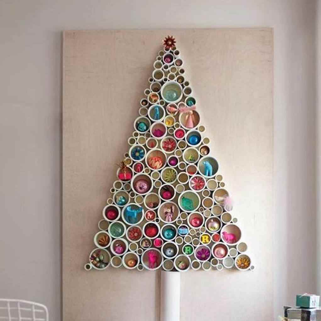 Цилиндры можно купить в строительном магазине или использовать втулки от туалетной бумаги. Покрасьте их в зеленый цвет и закрепите на листе картона или фанеры, чтобы композицию не пришлось разбирать в январе. Украшать эту елку даже проще, чем обычную: кладите игрушки прямо в цилиндры.