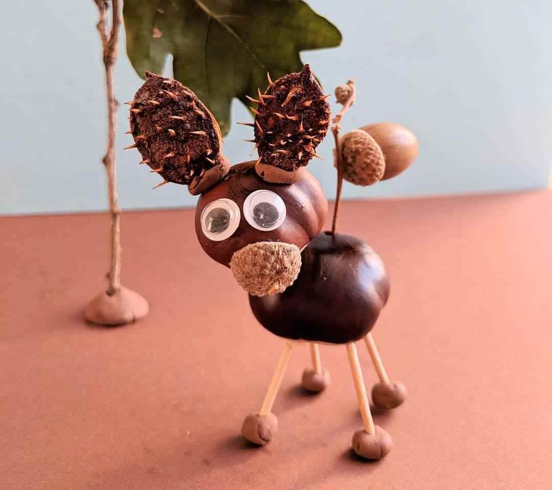 Можно смастерить и более сложные поделки, например, фигурку ослика. Вам понадобится пластилин, спички, каштаны и желуди.