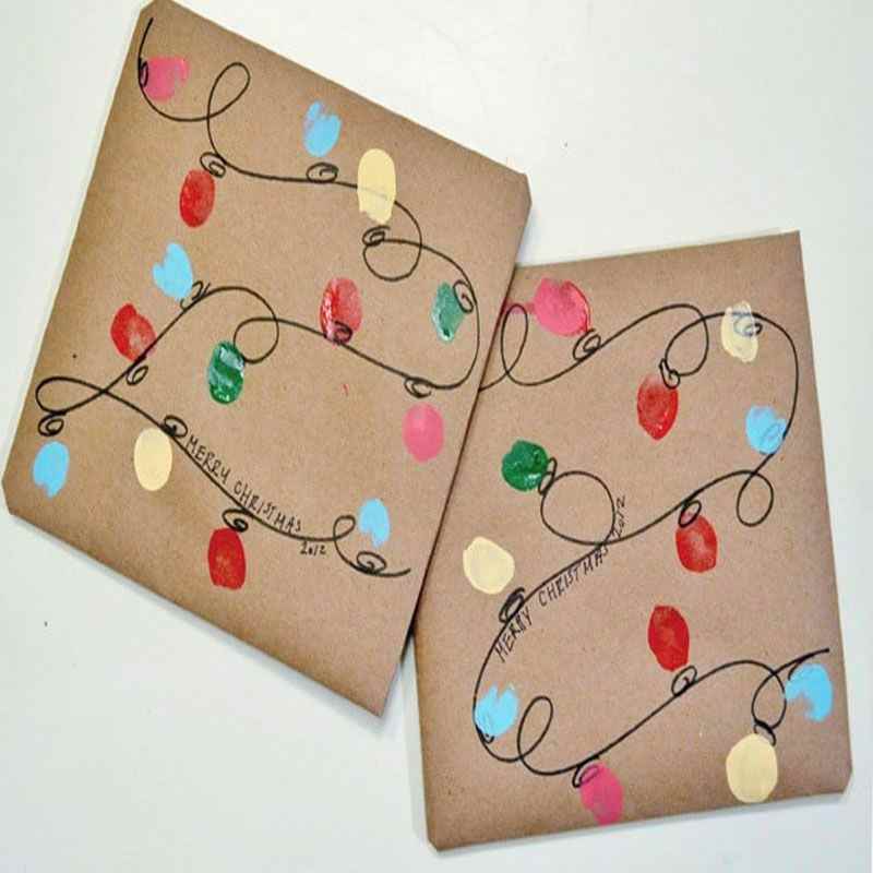 Нет помпонов? Можно украсить бумагу отпечатками пальцев и соединить их в виде новогодней гирлянды. Эта идея придется по душе детям, поэтому обязательно приобщайте их к упаковке подарков для бабушек и дедушек.