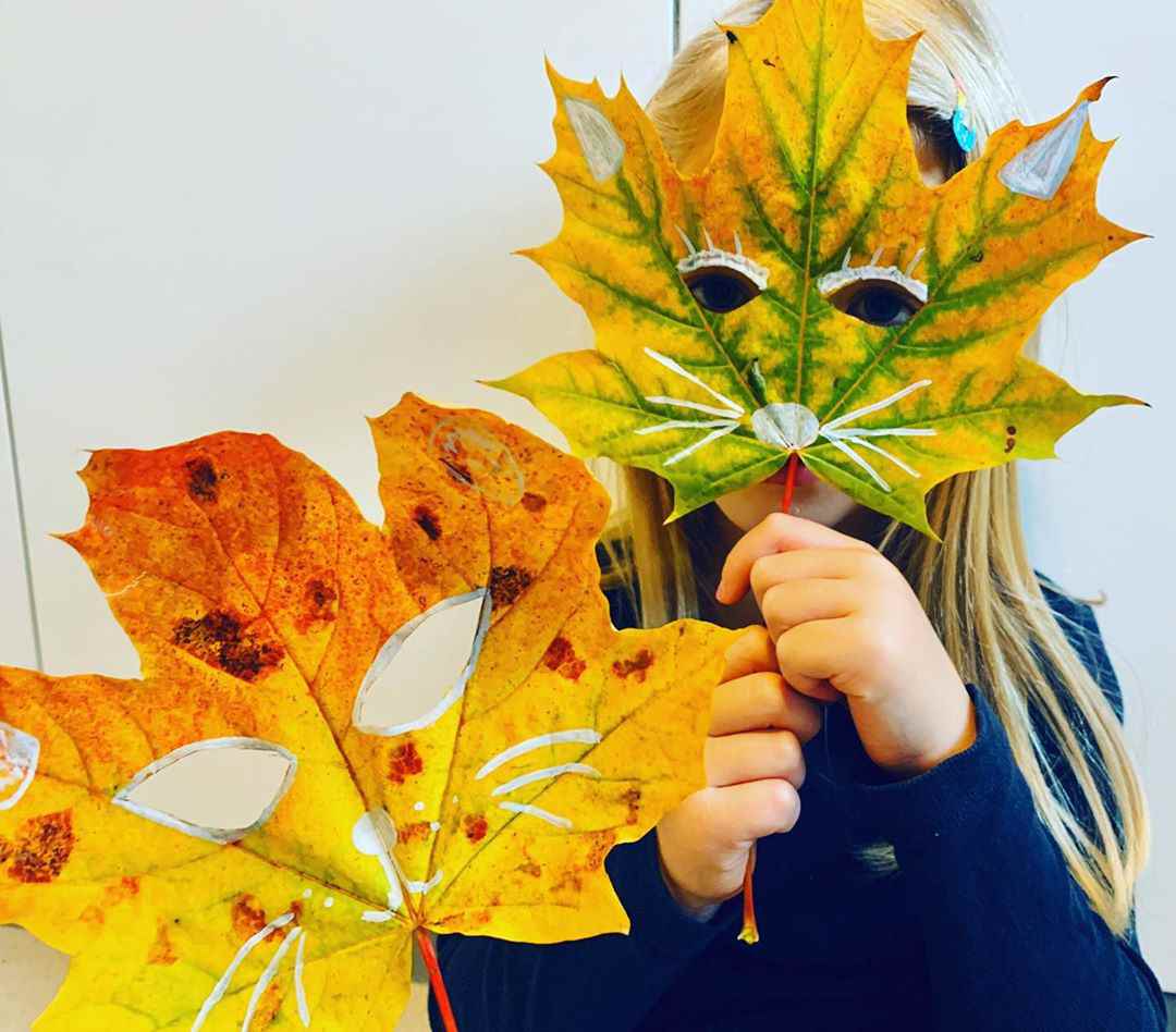 Из ярких кленовых листьев можно сделать для детей веселые маски, например, в виде кота.