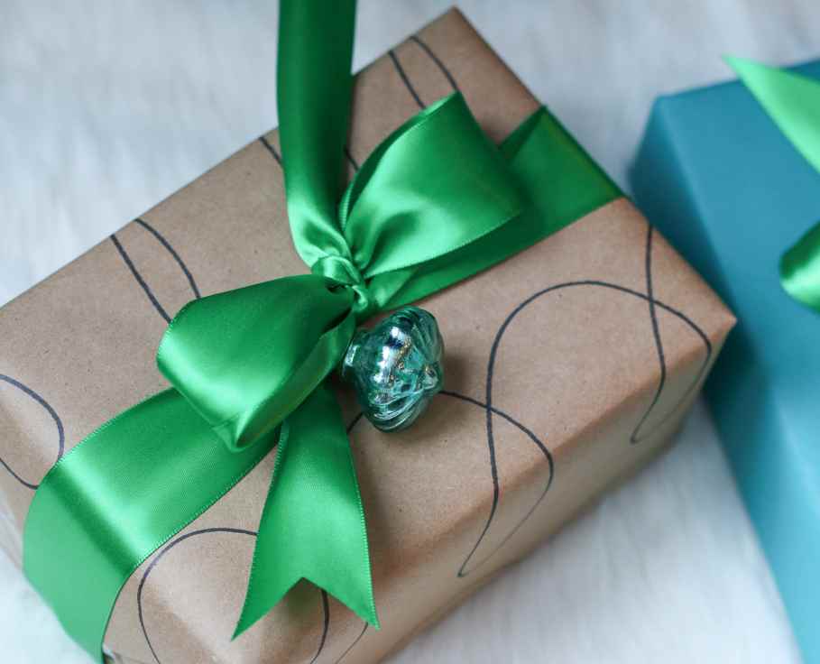 А если шишек и еловых веточек под рукой нет, то украсить подарок можно небольшой елочной игрушкой. Она придаст упаковке праздничности и уюта.