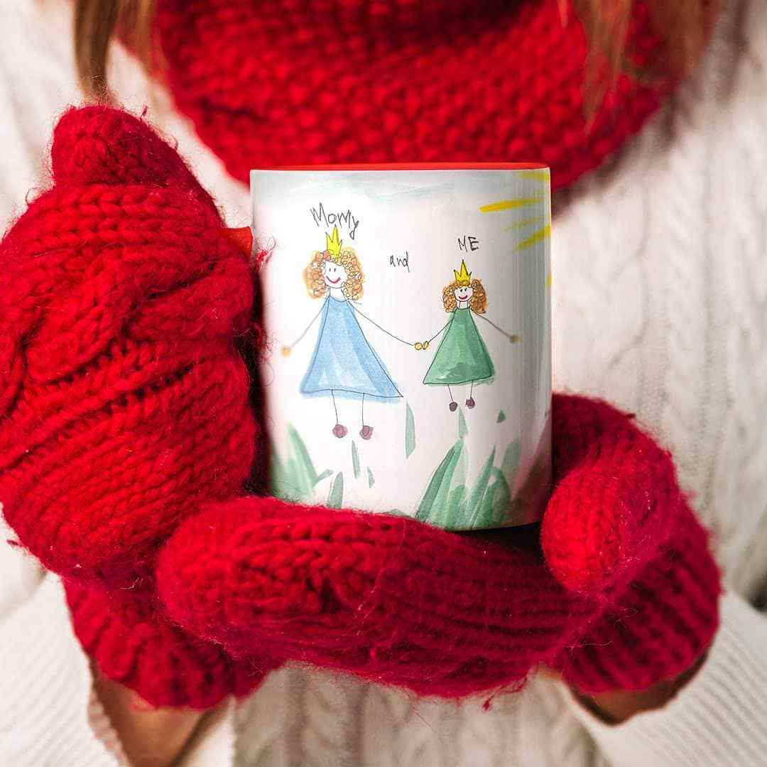 Также детский рисунок будет здорово смотреться на чашках. Для этого нужно найти студию, в которой вам нанесут на посуду рисунок по личному эскизу. Идея трудоемкая, зато вот каким будет результат.