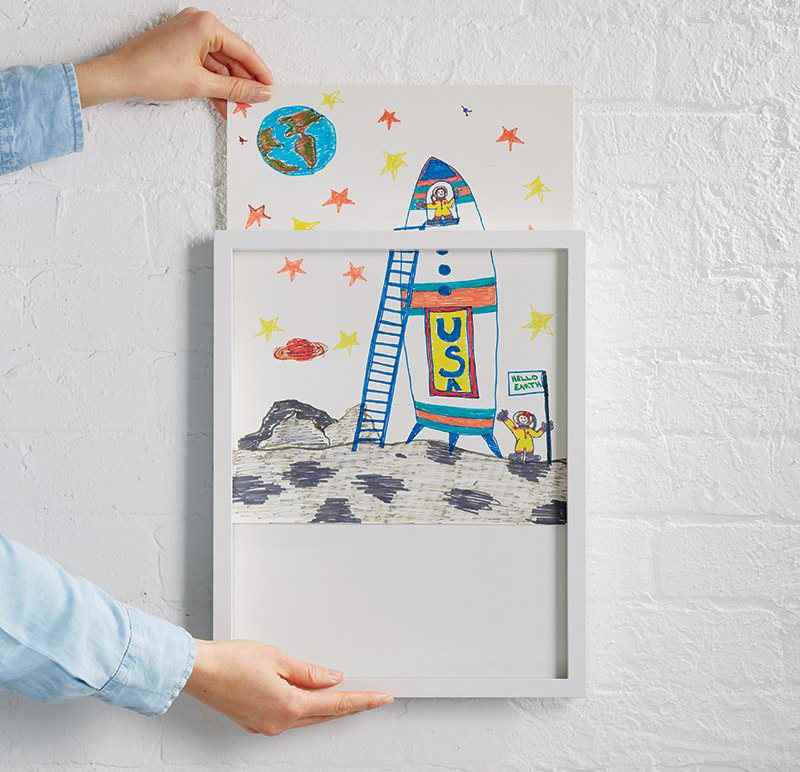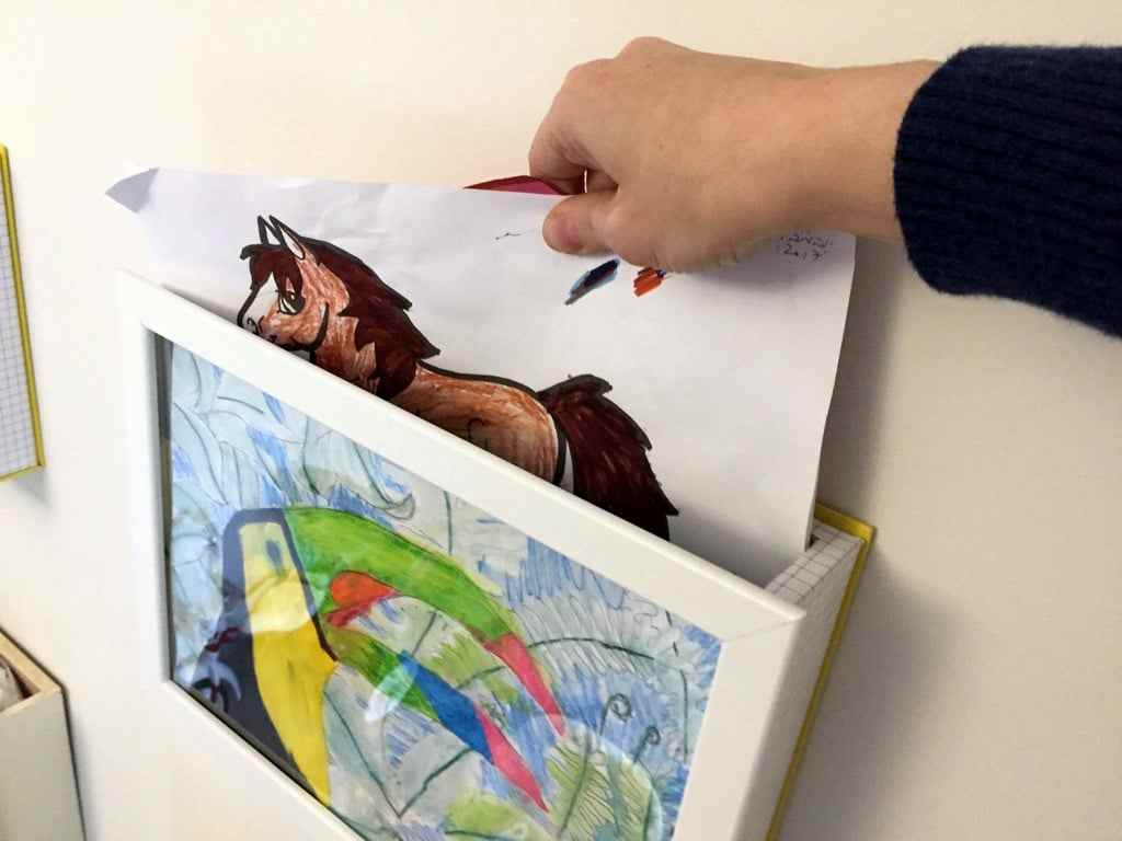 Можно купить специальные слайд-рамки, которые выглядят как настенные боксы со стеклом. В них вмещается не один, а несколько рисунков. Ребенок сможет сам складывать в такую рамку свои творения и выставлять самые свежие и любимые картины, которые хочется показать родителям.