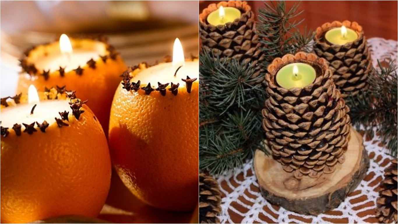 Добавить изящности дому и создать настроение помогут свечи. Их можно сделать из шишек, апельсина или просто красиво декорировать подсвечник