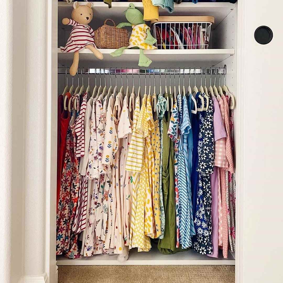 Компоновать детскую одежду можно по цветам радуги: красные майки — с красными, синие — с синими и т.д. Тогда шкаф, по мнению Мари, будет выглядеть не только более организованным, но и будет поднимать настроение за счет создания красочного цветового эффекта.