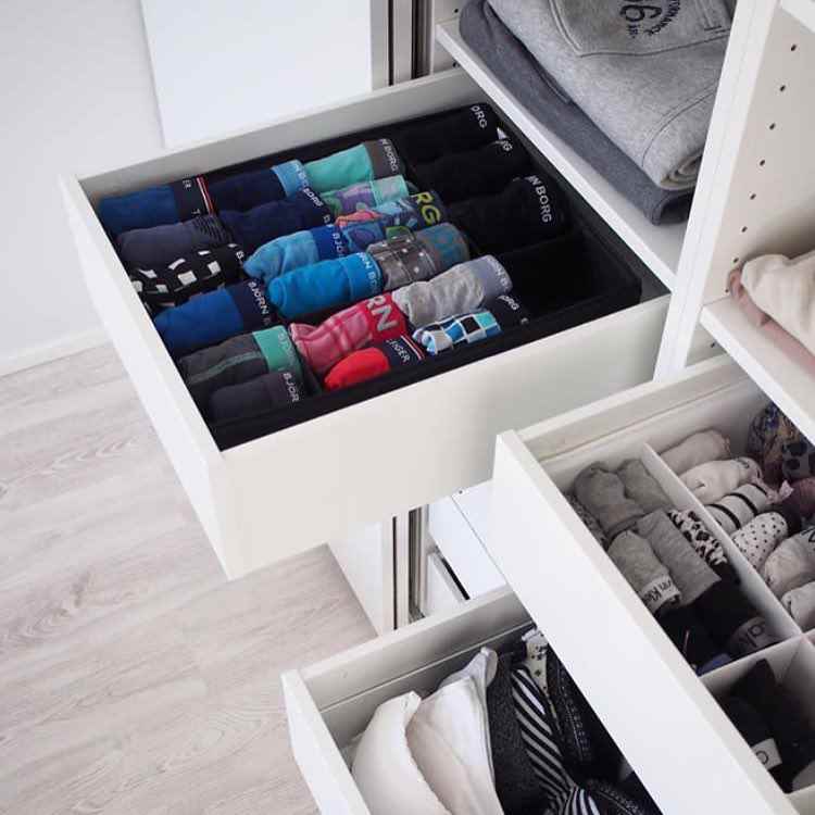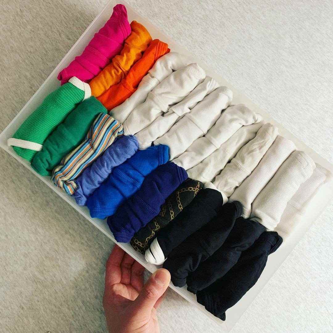 Это самый известный принцип организации пространства от Мари Кондо. Она убеждена, что так гораздо проще ориентироваться в шкафу/комоде и брать нужную вещь, не нарушая идеального порядка. Кроме того, одежда, сложенная таким образом, меньше мнется. «Хранение предметов в вертикальном положении не только экономит место, но и позволяет сразу увидеть все вещи. И утренние сборы в таком случае становятся менее стрессовыми, вам не кажется?» — объясняет Мари.