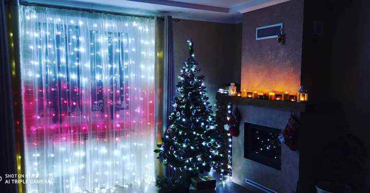 А в этих квартирах решили декорировать окна с помощью светодиодных гирлянд.