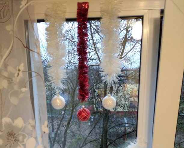 А те, кому не хочется вырезать и клеить элементы из бумаги, подвешивают к оконной раме красочные гирлянды с елочными шариками.
