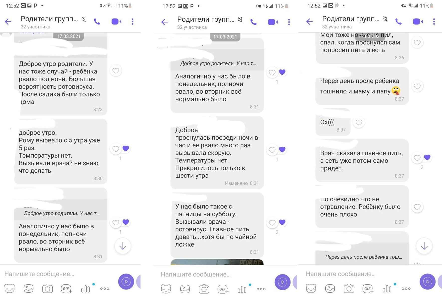 Родители не понимают, почему группы не закрываются на карантин, и в них не проводится санобработка. Судя по переписке в чате, многие обращались к врачу, а кто-то даже вызывал скорую. Часть родителей решили своими силами провести дезинфекцию в группе.