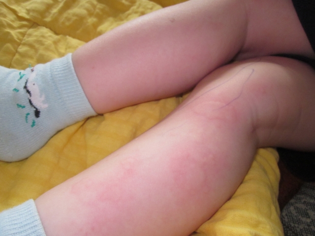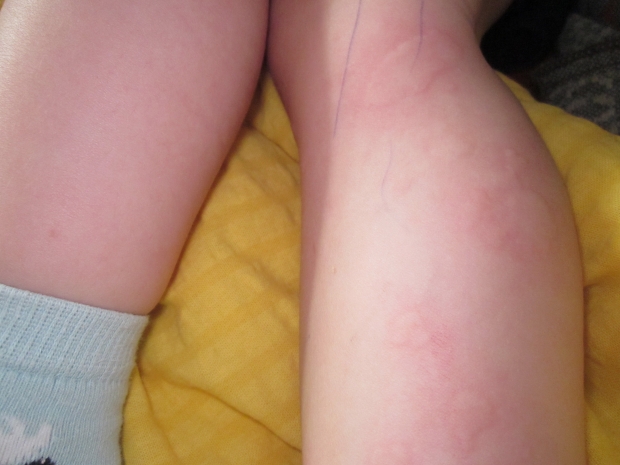 Похоже у моего красавчика крапивница. розовые выпуклые пятна на коже с неровными четкими краями.Размер разный, одно пятно размера сливы, другие поменьше…Они даже не розовые,а цвета кожи.Через какое-то время расходятся, и кожа принимает обычный вид.Вчера возникло на щечках. Я даже решила, что его покусали, но комаров в комнате не было.Сегодня уже на ножках. Показать врачу не могу — они расходятся со временем.Я заметила только когда начала переодевать,а так они и незаметны. Только после сна в жарком помещении, он немного побегает — и всё — ничего нет.